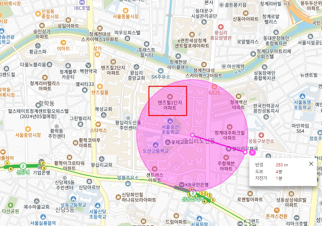 " 텐즈힐1단지 " 아파트는 상왕십리역에서 도보로 4분정도에 있는 역세권이네요.