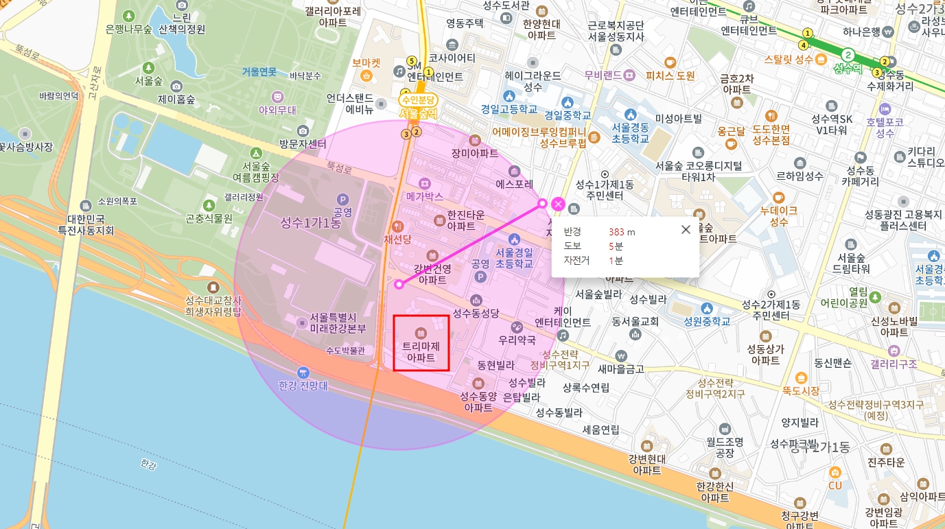지도로 " 트리마제 " 아파트 확인해 보니까,