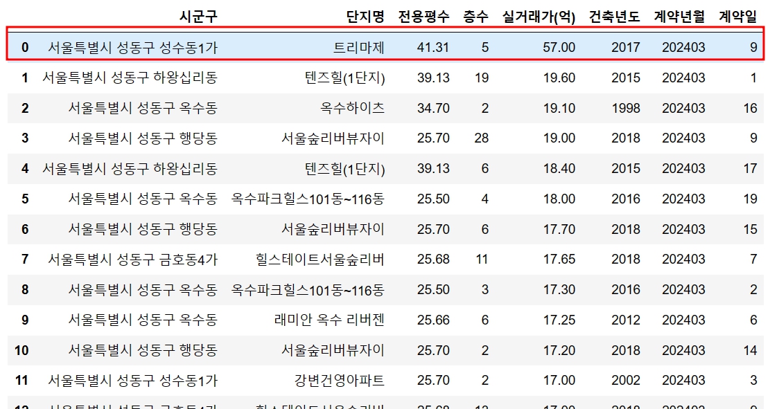 * 성동구에서 매매된 아파트명: 트리마제 텐즈힐(1단지) 옥수하이츠 서울숲리버뷰자이 옥수파크힐스101동~116동 힐스테이트서울숲리버 래미안 옥수 리버젠 강변건영아파트 이편한세상금호파크힐스 옥수삼성 신금호파크자이 대림(1차) 텐즈힐(2단지) 현대I-PARK 옥수파크힐스117동~125동 서울숲2차푸르지오 금호삼성래미안 금호자이1차 행당두산위브 대우 서울숲푸르지오 벽산 센트라스 행당한진타운 래미안하이리버 왕십리KCC스위첸 신동아 서울숲행당푸르지오 쌍용 왕십리자이 한진해모로 대림강변타운 서울숲 한신 더 휴 극동 금호현대 현대 대림e-편한세상 동아그린 금호1차푸르지오 두산 삼성 센트럴큐브