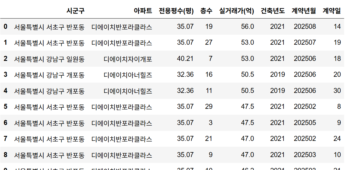 2025년 1월~11월에 거래된, 하이엔드(고급화) 아파트 " 디에이치(현대건설) " - 매매된 정보(전용평수, 층, 실거래가격, 건축연도, 계약월)