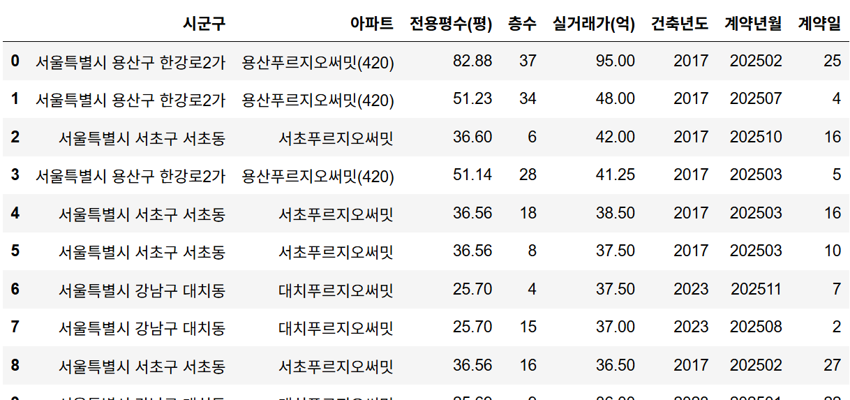 2025년 1월~11월에 거래된, 하이엔드(고급화) 아파트 " 푸르지오써밋(대우건설) " - 매매된 정보(전용평수, 층, 실거래가격, 건축연도, 계약월)