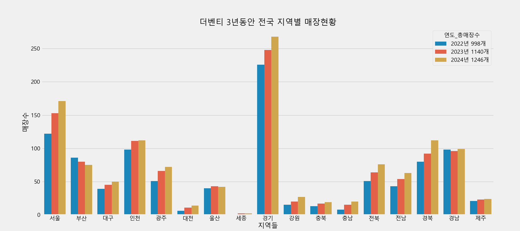 일단, 그래프 오른쪽을 보면, 연도별 총매장 개수가 나와있죠. 2022, 2023, 2024년.